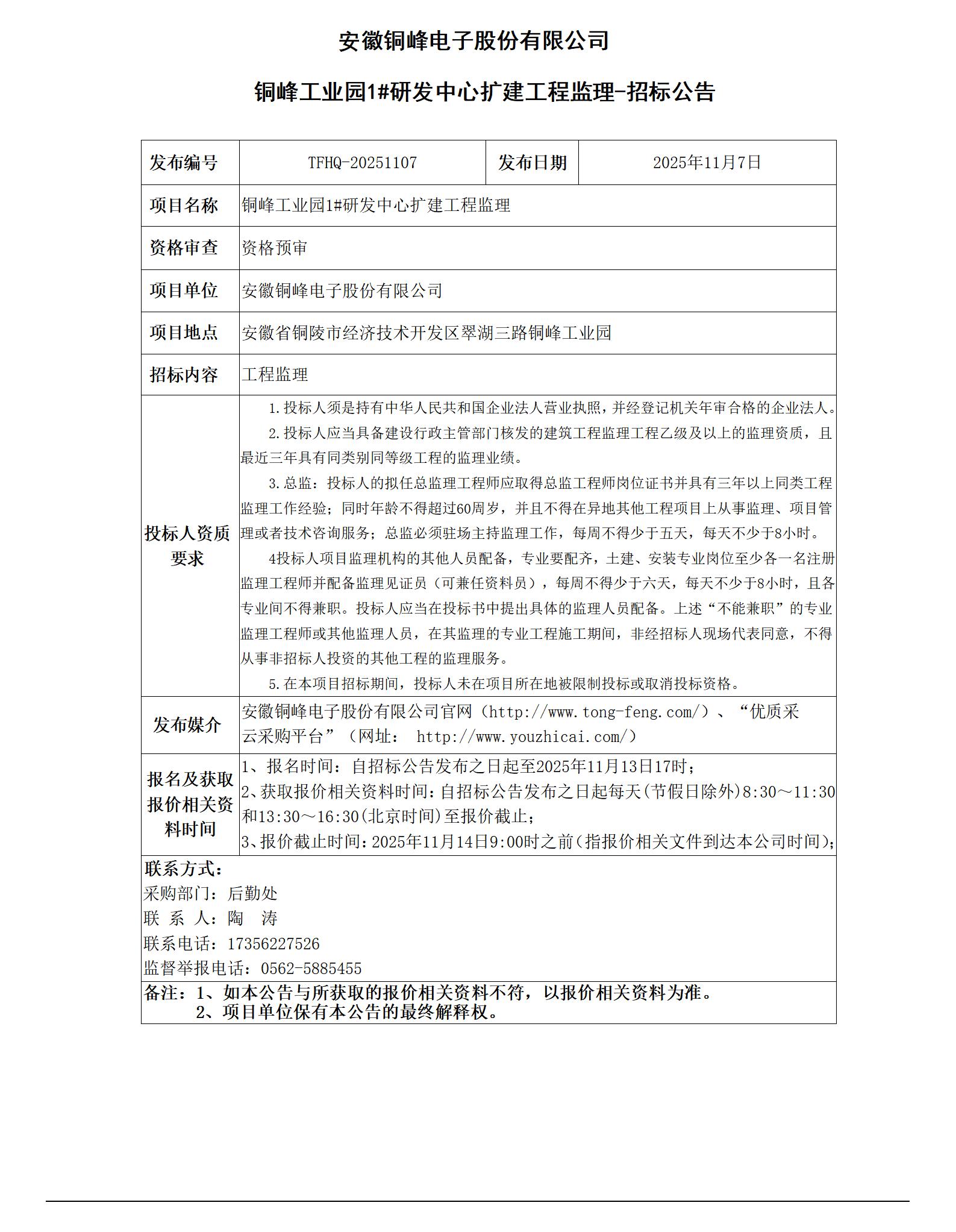 安徽銅峰電子股份有限公司 (銅峰工業(yè)園1#研發(fā)中心擴建工程監(jiān)理 招標(biāo)公告)_01