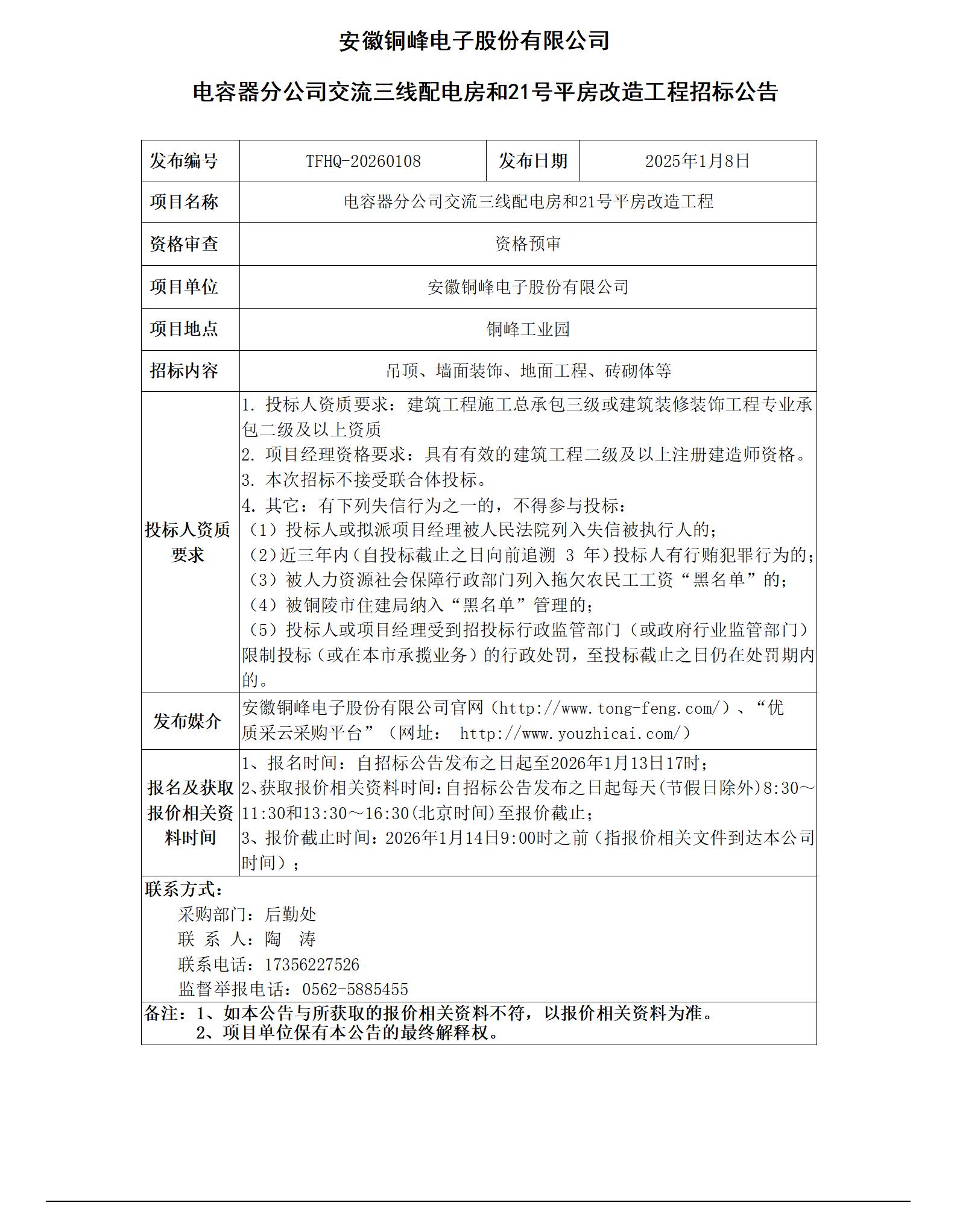 01-安徽銅峰電子股份有限公司 (電容器分公司交流三線配電房和21號(hào)平房改造工程 招標(biāo)公告)_01
