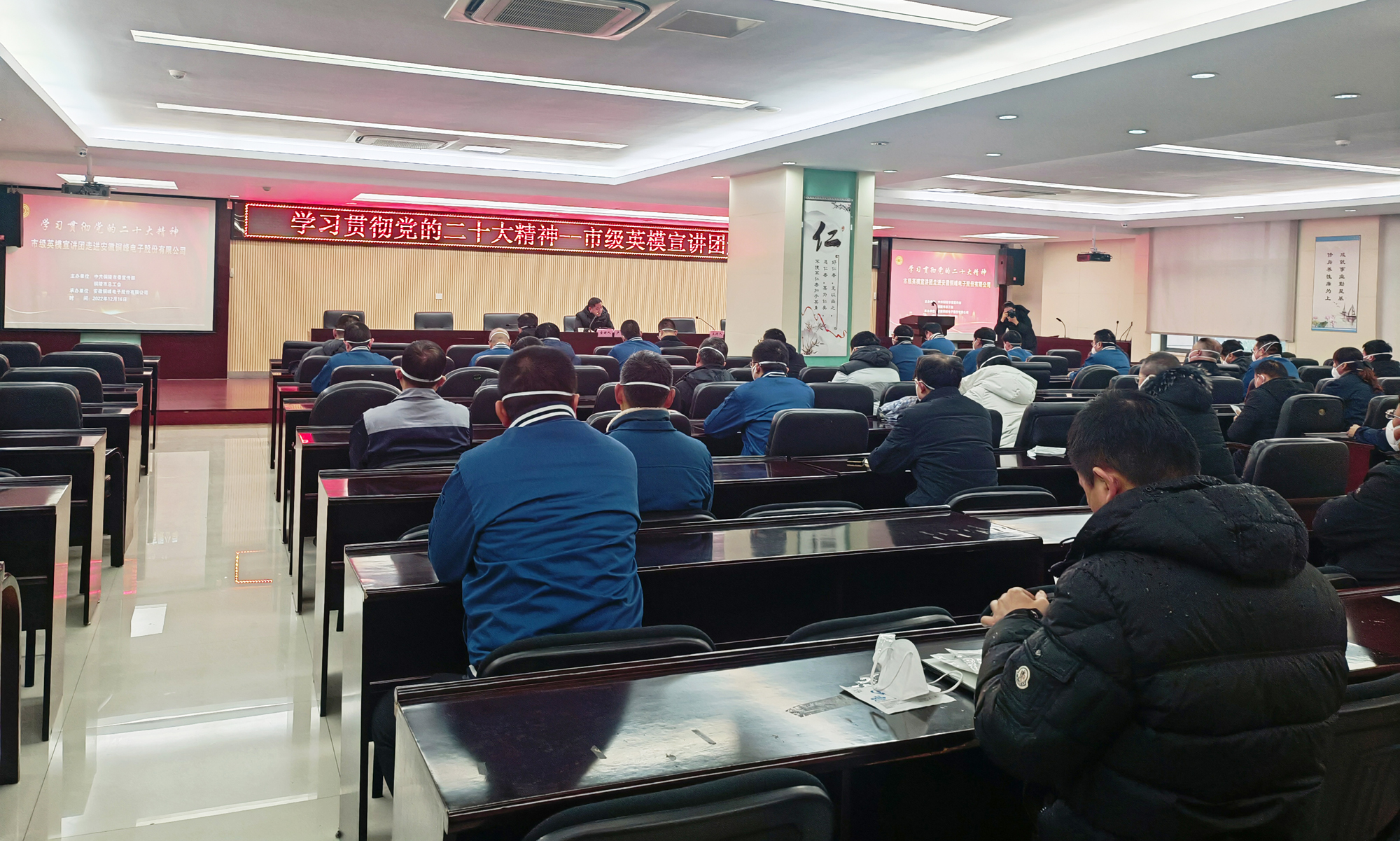為深入學(xué)習(xí)宣傳貫徹黨的二十大精神,大力弘揚(yáng)勞模精神、勞動(dòng)精神、工匠精神,推動(dòng)黨的創(chuàng)新理論深入人心、落地生根,12月16日下午,由市委宣傳部、市總工會(huì)主辦、公司承辦的“學(xué)習(xí)貫徹黨的二十大精神--市級(jí)英模宣講團(tuán)走進(jìn)銅峰電子”宣講報(bào)告會(huì)在公司辦公樓二樓職教室舉行。會(huì)上邀請(qǐng)全國(guó)五一勞動(dòng)獎(jiǎng)?wù)芦@得者、銅陵金隆銅業(yè)公司技術(shù)主管盧鵬勞模作黨的二十大精神專(zhuān)題宣講。公司黨委書(shū)記、董事長(zhǎng)黃明強(qiáng)等公司黨政領(lǐng)導(dǎo)班子成員參加宣講報(bào)告會(huì),公司各黨支部書(shū)記、分工會(huì)主席和先進(jìn)模范、新黨員、入黨積極分子、群眾代表等聆聽(tīng)了報(bào)告。宣講報(bào)告會(huì)由公司黨委副書(shū)記潘世宇主持。